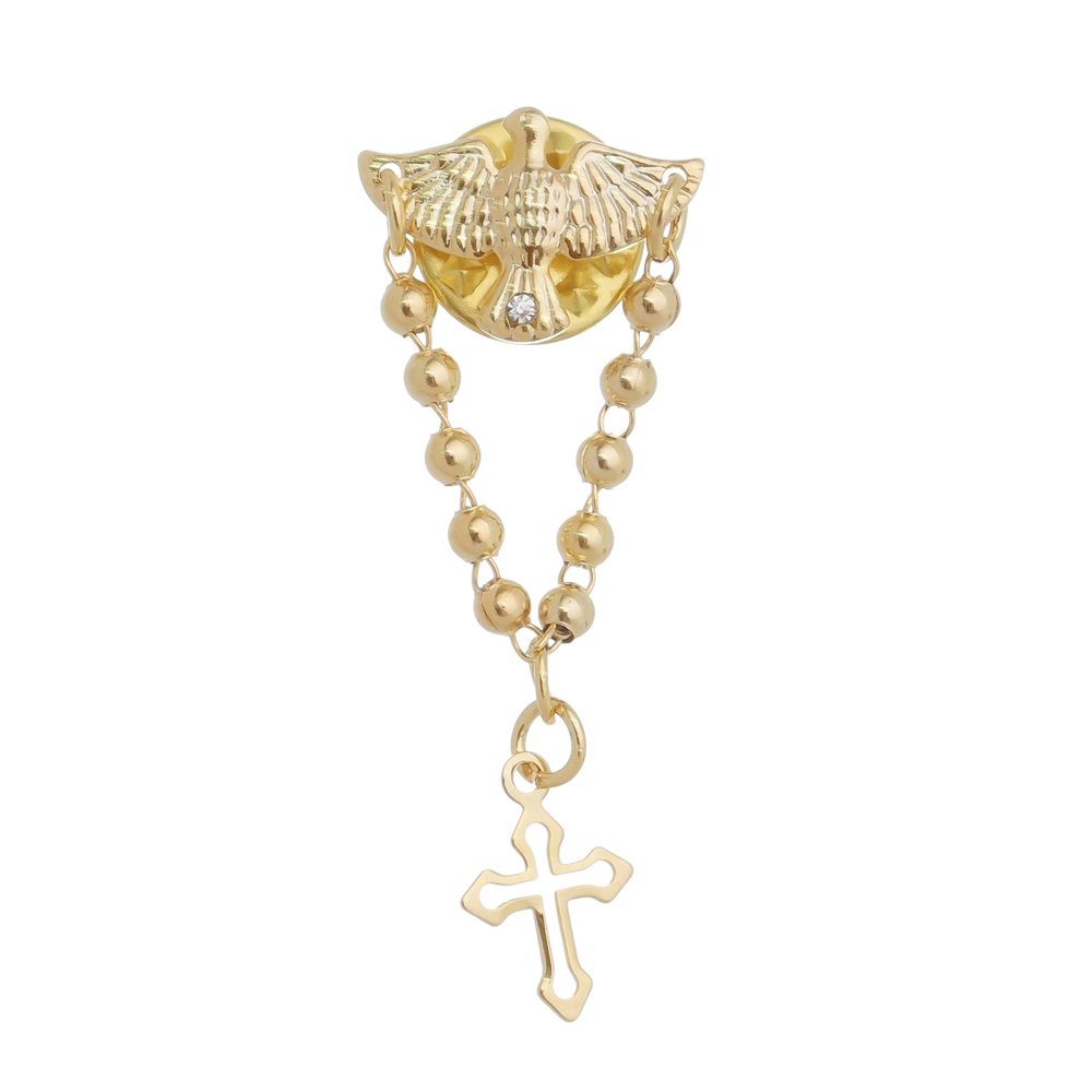 Bóton folheado com imagem do Divino Espírito Santo com detalhe em strass, dezena com crucifixo vazado.
