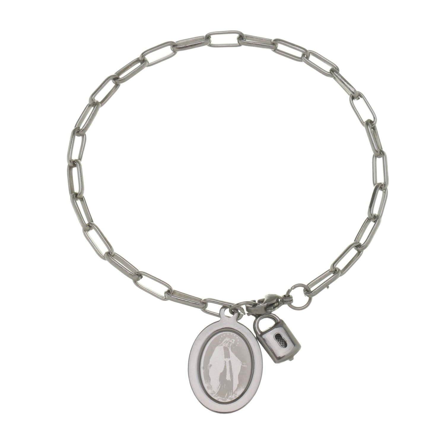 Apresentamos o mais recente lançamento da MPS Store: a bela cadeia da consagração em inox. Esta peça exclusiva conta com um cadeado e uma medalha gravada a laser nos dois lados: um lado exibe a imagem de Nossa Senhora das Graças e o outro lado apresenta parte da Medalha Milagrosa, com a Cruz, o M, os Sagrados Corações de Jesus e Maria, e as 12 estrelas ao redor. O fecho prata permite ajustar o acessório ao pulso com facilidade.