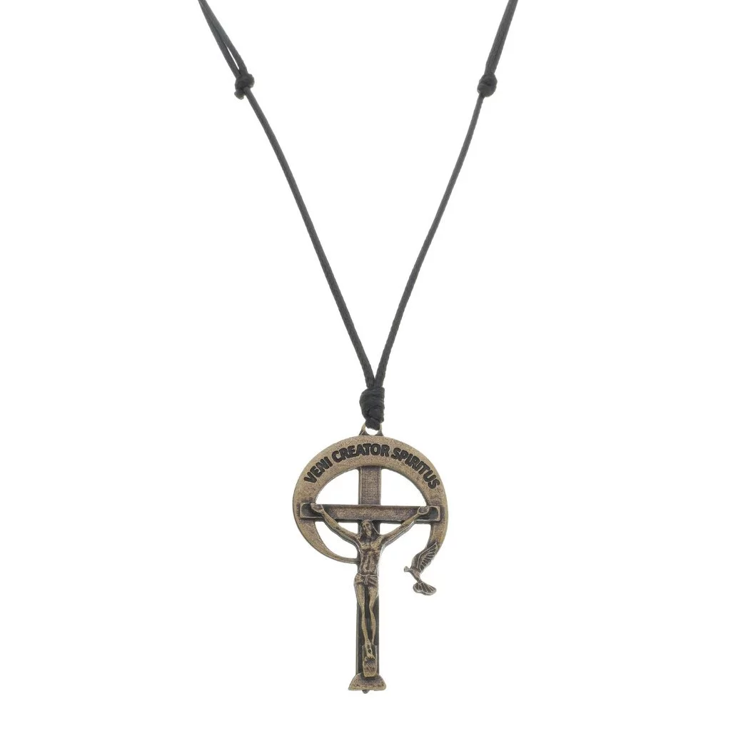 Cordão de Couro com Crucifixo da RCC em Metal - Ouro Velho - Tamanho G