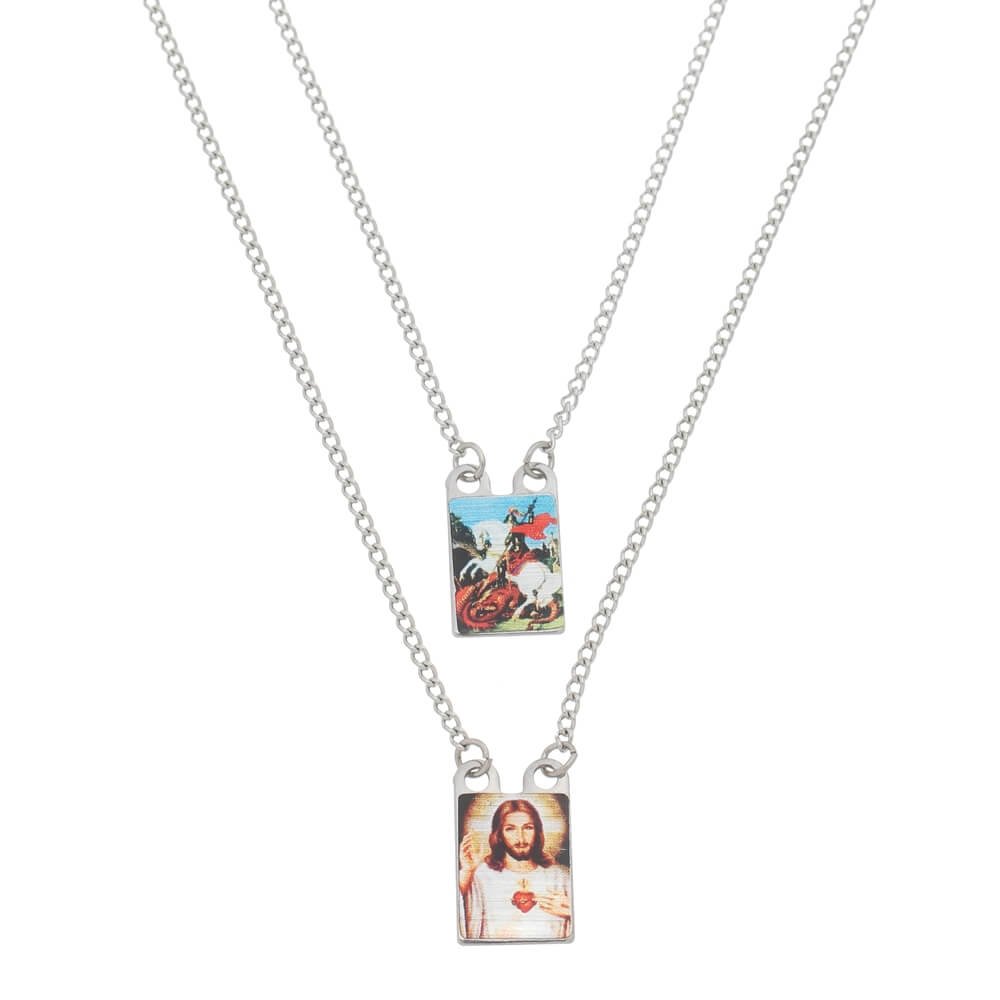 Lindo escapulário em inox de São Jorge e do Sagrado Coração de Jesus. É perfeito para o uso no dia a dia e uma bela e significativa opção de presente católico para amigos e familiares. Demonstre todo o seu carinho e zelo por quem você ama, presenteando com esse belo acessório religioso!