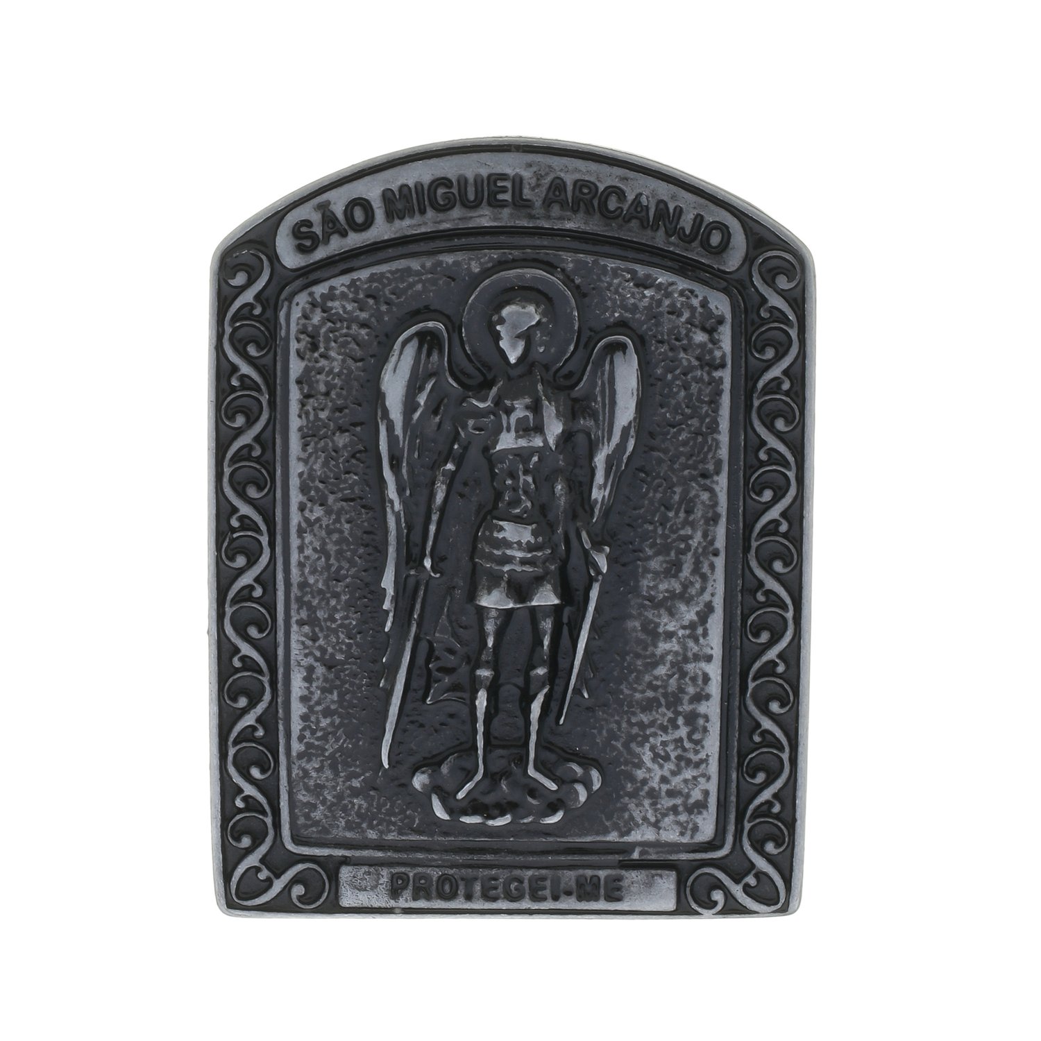 O produto da Sagravia é inteiramente feito de metal na cor de prata envelhecida, em um modelo simples e rústico ele contém a imagem de São Miguel Arcanjo em cima de uma nuvem vestido com sua armadura, segurando suas armas e com uma auréola na cabeça. Além disso, a borda da peça é bem detalhada e traz as inscrições: “SÃO MIGUEL ARCANJO” (na parte superior) e “PROTEGEI-ME” (na parte inferior). Atrás do mini quadro há um suporte.