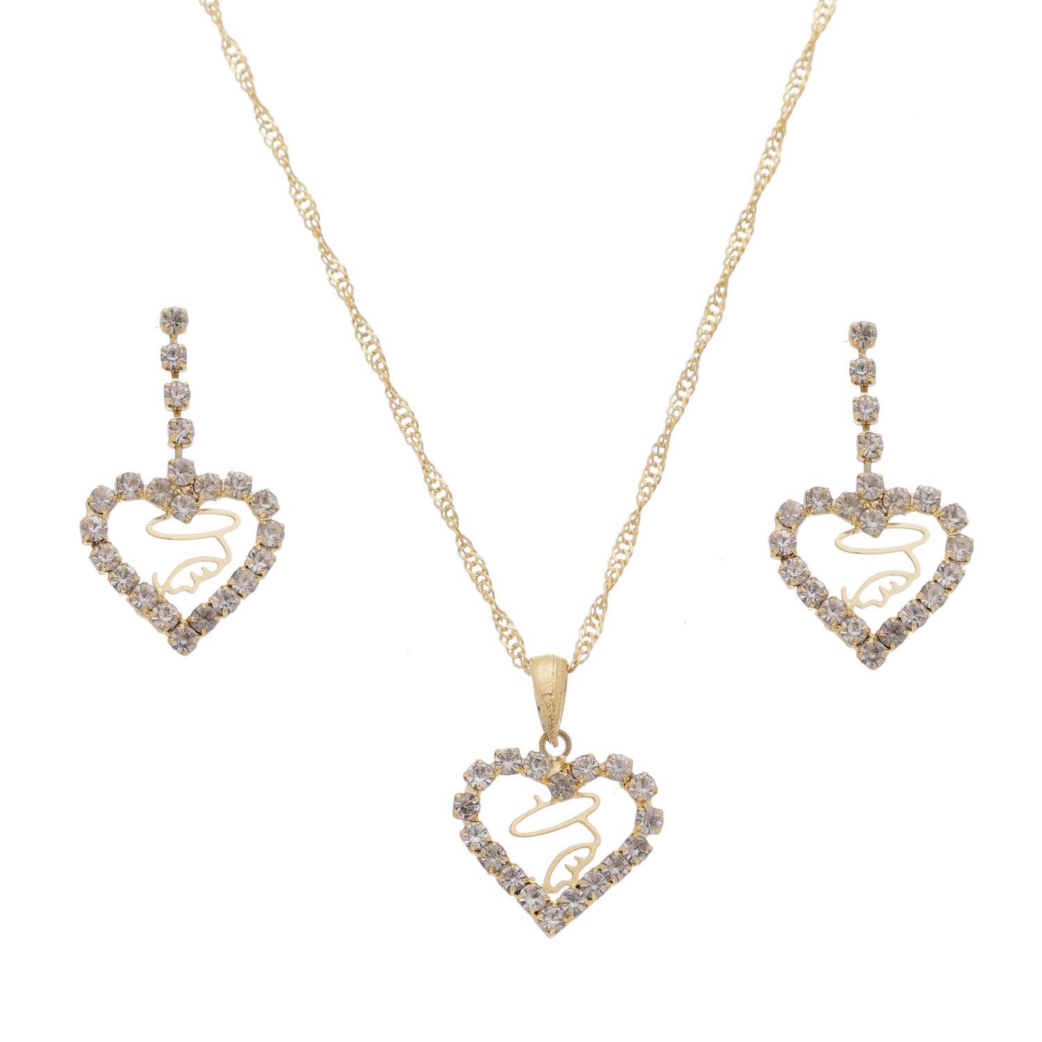 A Sagravia traz este lindíssimo conjunto folheado! Os brincos são trabalhados em strass e, com pingentes vazados em formato de coração, a imagem de Nossa Senhora do Silêncio se posiciona no centro na cor dourada. A tarraxinha ajuda no ajuste da peça na orelha. O colar dourado tem o pingente da mesma maneira que os brincos. Na extremidade da corrente torcida, há um fecho que possibilita abrir e fechá-lo conforme a necessidade. Para segurança do conjunto, ele é embalado em uma caixinha preta com tampa transparente, e dentro dela, há uma espuma branca.