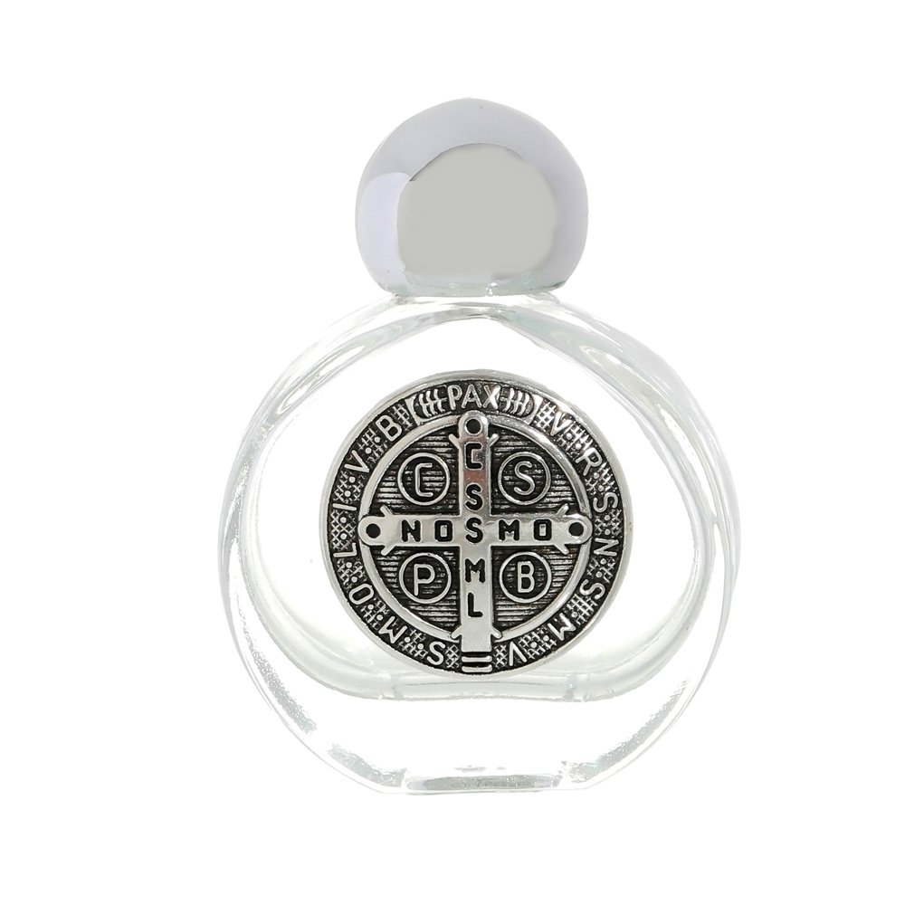 Garrafa para água benta, de vidro transparente e com imagem da medalha de São Bento em metal na cor prata velha, tampa de plástico na co prata.
