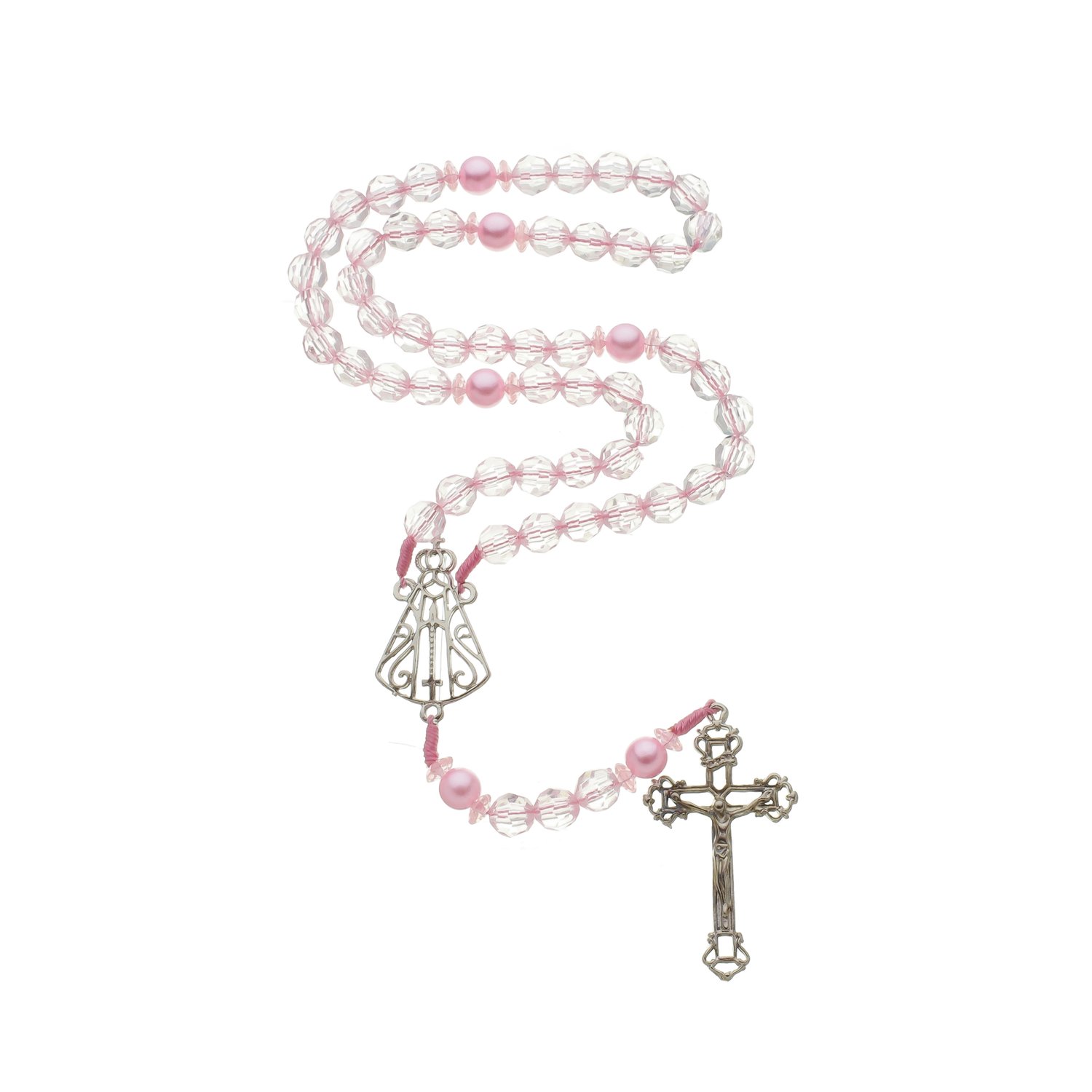 A MPS Store traz este lindo terço para a coleção! As peças contêm barbante rosa, contas pérola de plástico na cor rosa translúcido, entremeios pérola rosa cintilante e, em metal prata, uma medalha vazada de Nossa Senhora Aparecida e um crucifixo também vazado.