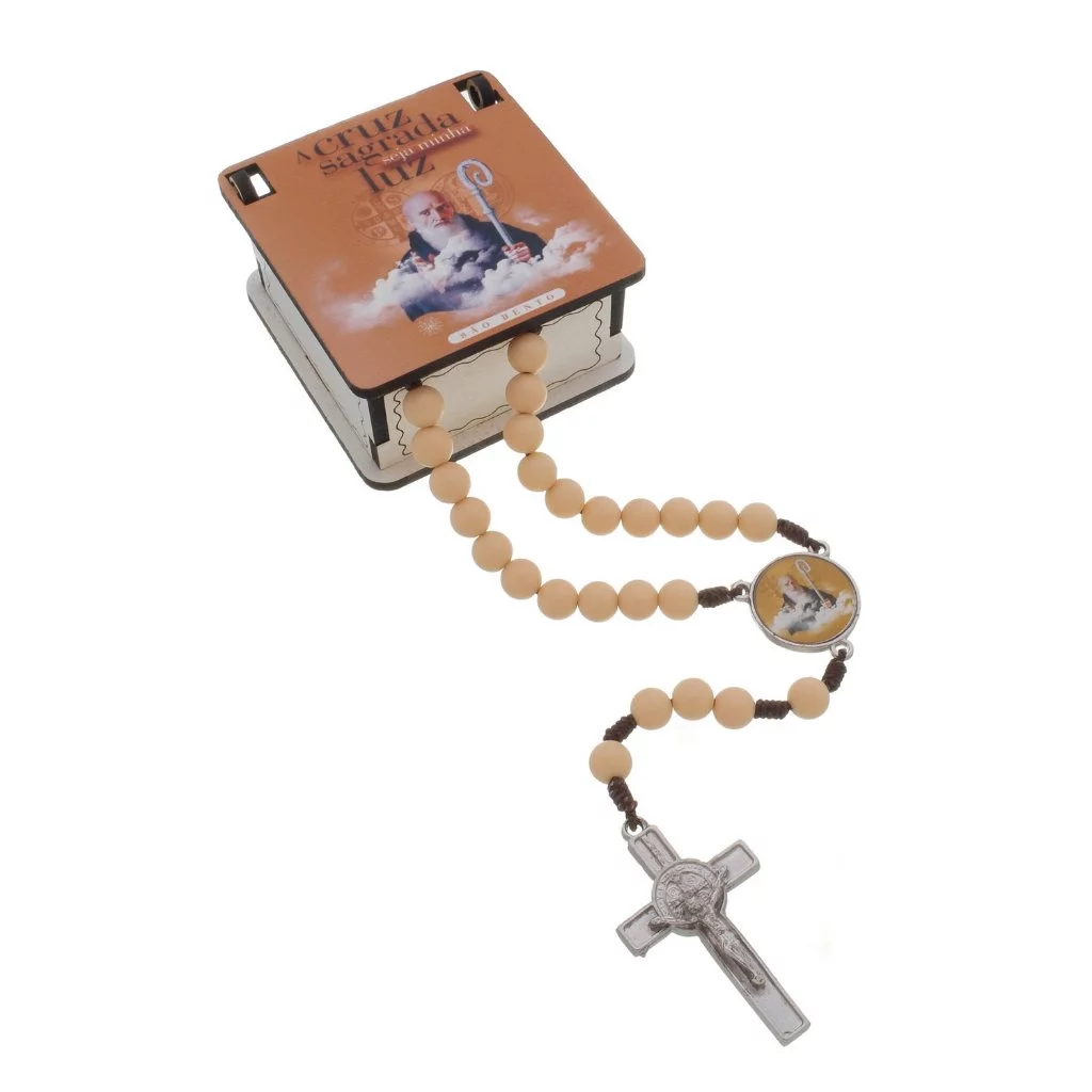 Terço com porta-terços em MDF da MPS Store para você não deixar de fora do estoque! O terço com barbante marrom escuro contém contas na cor creme fosco, uma medalha redonda (de um lado há a imagem de São Bento em fundo mostarda com nuvens e do outro lado há a inscrição "SÃO BENTO" com fundo igual da imagem) e um crucifixo inteiramente metal prata com a Medalha de São Bento atrás de Jesus Crucificado. O porta-terços branco, contém em sua tampa a mesma figura da medalha e nela contém também as inscrições "A Cruz Sagrada seja minha luz" e "SÃO BENTO".