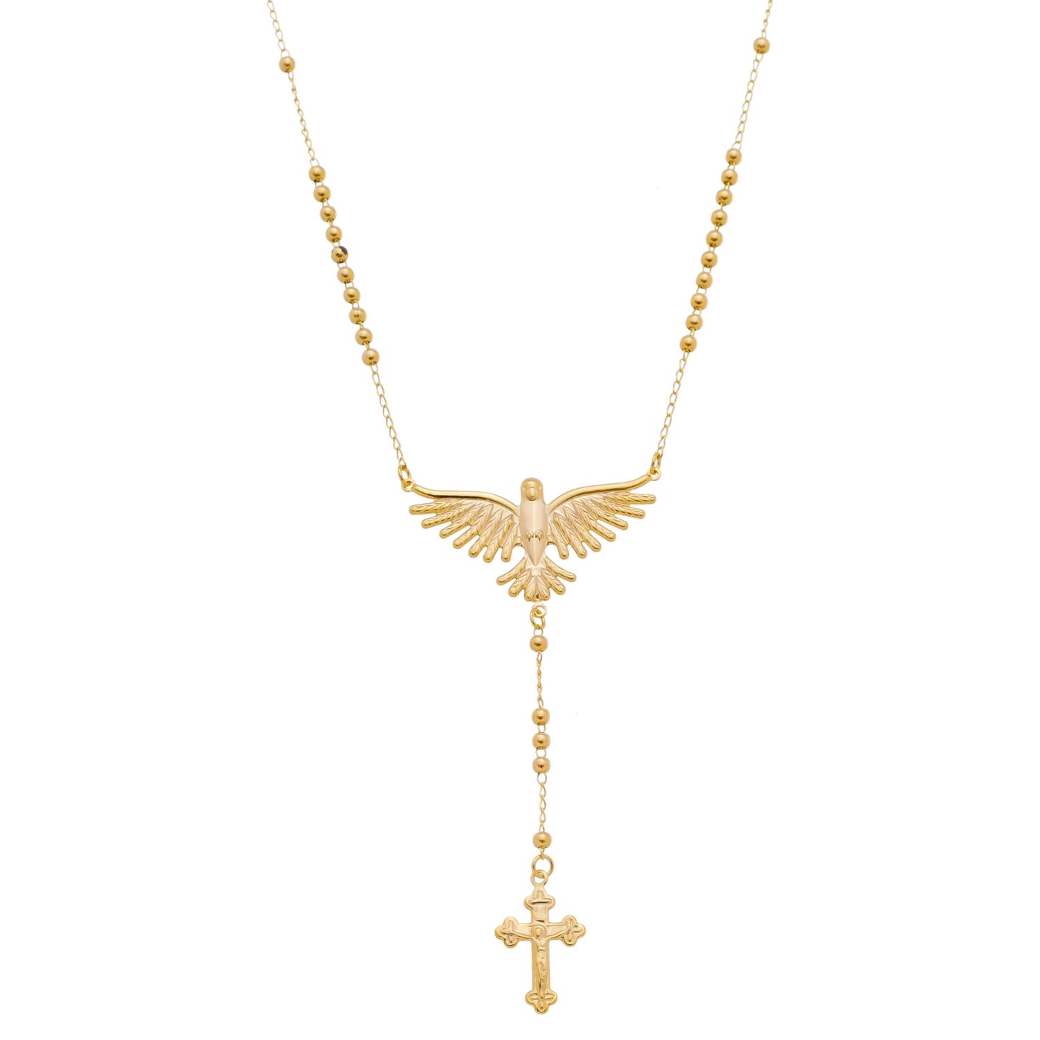 Expresse sua devoção com este belíssimo terço de pescoço folheado, com acabamento fino, contas delicadas de 4mm e detalhes em strass. A medalha do Divino Espírito Santo e o crucifixo completam o visual com beleza e espiritualidade.