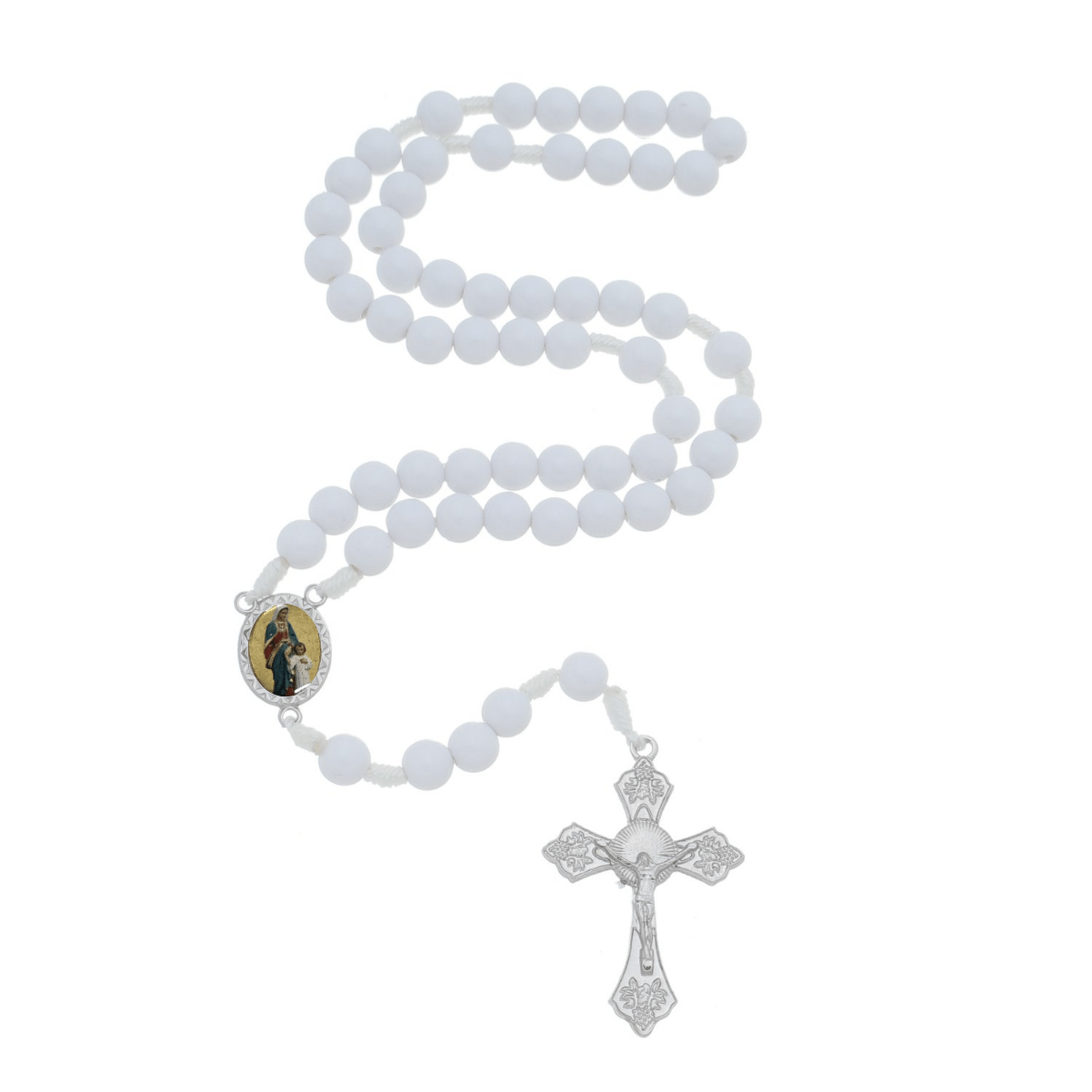 Terço devocional com contas em pérola branca, medalha em metal prateado com imagem colorida de Maria Passa na Frente e crucifixo detalhado em metal.